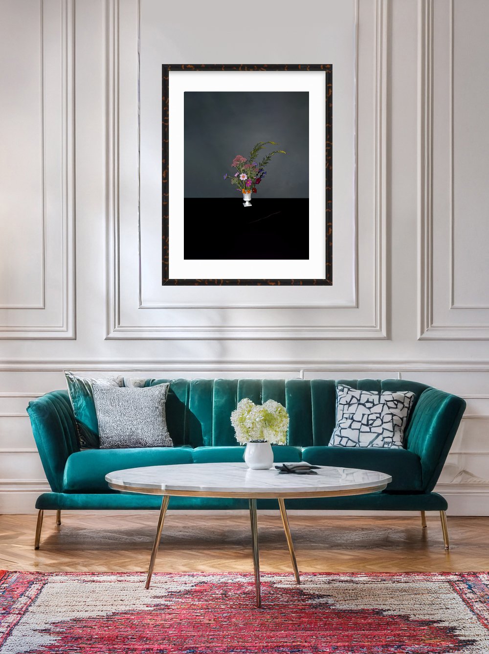 Tall locally foraged goldenrod mixed with a vibrant flower arrangement that pops off the dark background in this still-life photograph created by Sarah. Original photograph made into a giclee print. Inspired by the rich elegance of 17th-century Dutch painters and the romantic imagery of J. W. Waterhouse paintings. Original fine art photography that celebrates the blooms grown in Sarah’s flower garden. Capturing the beauty of fresh cut flowers, snapdragon, marigolds, gazania, gomphrena, sedum, cosmos arranged whimsically in tall vintage glass vases.