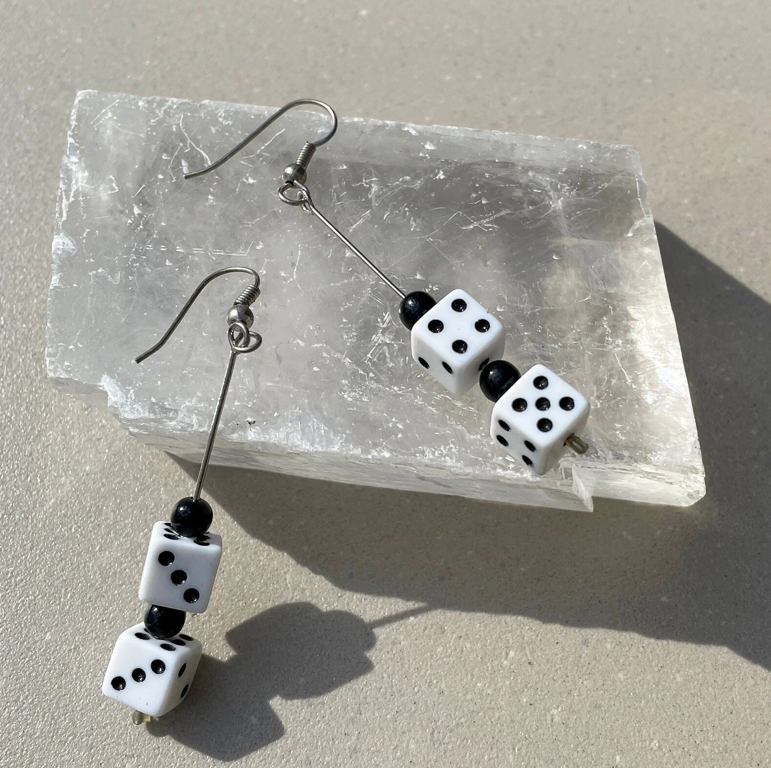 Fun 90's long drop earrings with two dice and black round beads. Great for kids and adults. Silver color, stainless steal hook ear wire closure hanging earrings. Dice are made of plastic, making these earrings very lightweight.